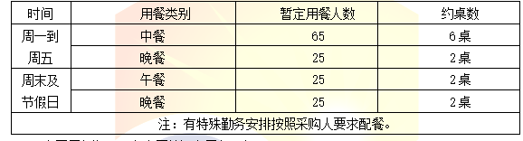 采購需求:主要包括提供食堂全年所有食材,調(diào)料、食堂洗滌用品、清潔用品等消耗品,提供該食堂的廚師、幫廚等。