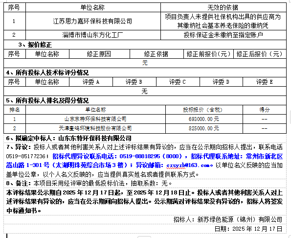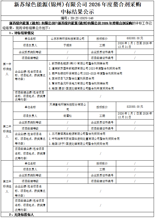 新蘇綠色能源(錦州)有限公司2026年度螯合劑采購 中標(biāo)結(jié)果公示